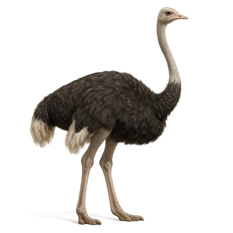 Der Afrikanische Strauß ist der größte lebende Vogel der Welt und lebt in den offenen Savannen und Halbwüsten Afrikas. Strauße können bis zu 2,7 Meter groß werden und bis zu 156 Kilogramm wiegen. Sie haben lange, kräftige Beine, die ihnen eine bemerkenswerte Geschwindigkeit von bis zu 70 km/h ermöglichen, was sie zu den schnellsten laufenden Vögeln macht. Ihr Gefieder ist dicht und flauschig, wobei die Männchen meist schwarze und weiße Federn und die Weibchen graubraune Federn haben.